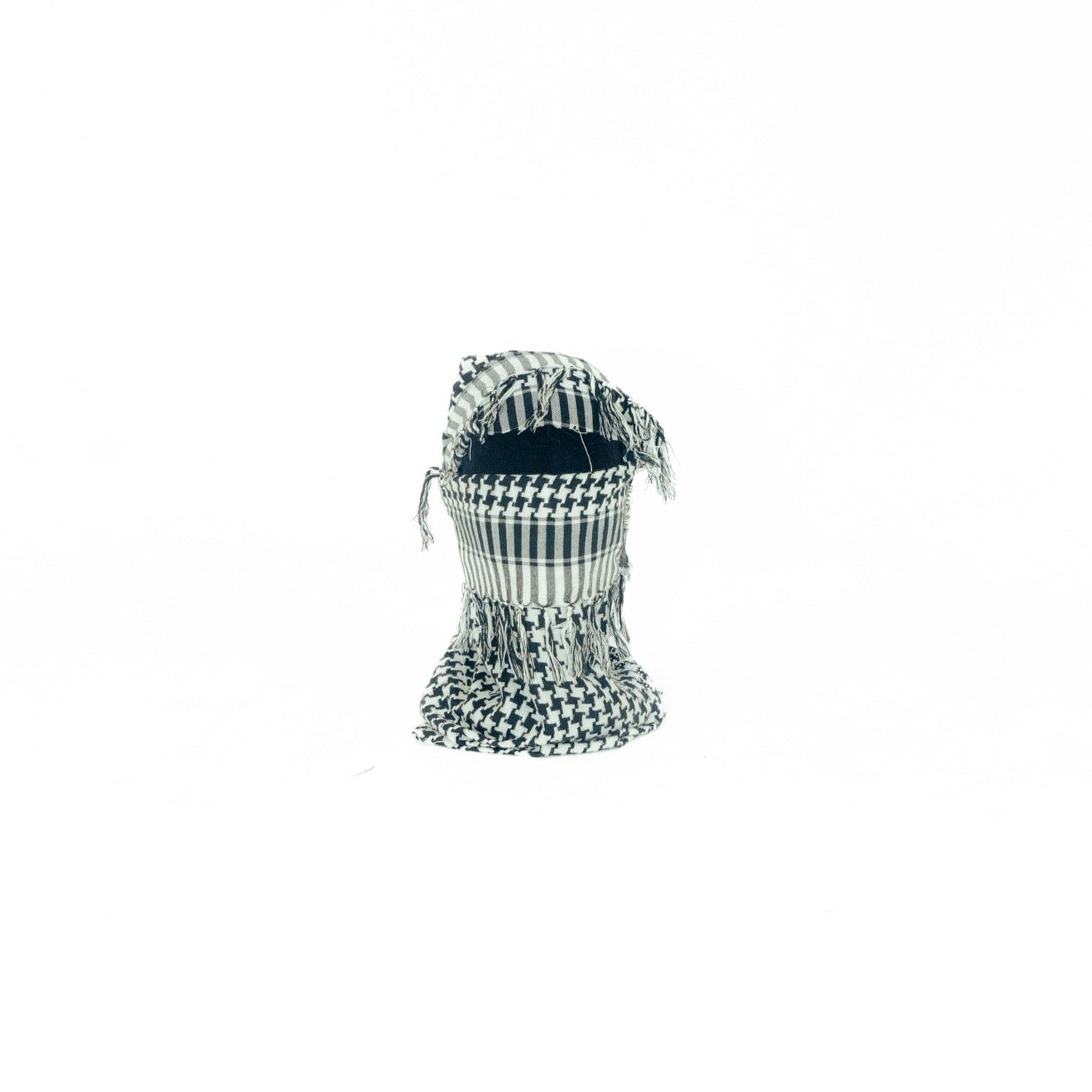 This draped houndstooth printed scarf balaclava is the coolest light weight statement piece. This balaclava has a rhinestone gem print on the side. This product is extremely limited in stock and won't be restocked.